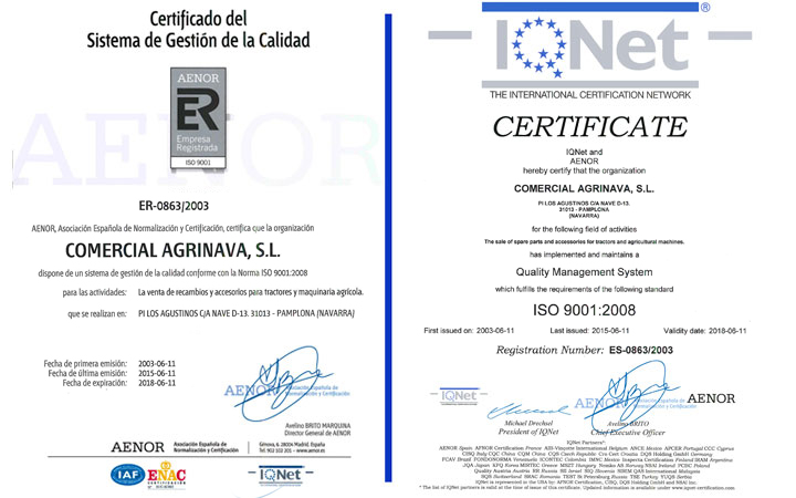 Como resultado del esfuerzo que realiza AGRINAVA en la mejora de la calidad, tenemos los certificados emitidos por AENOR según la norma ISO-9001.